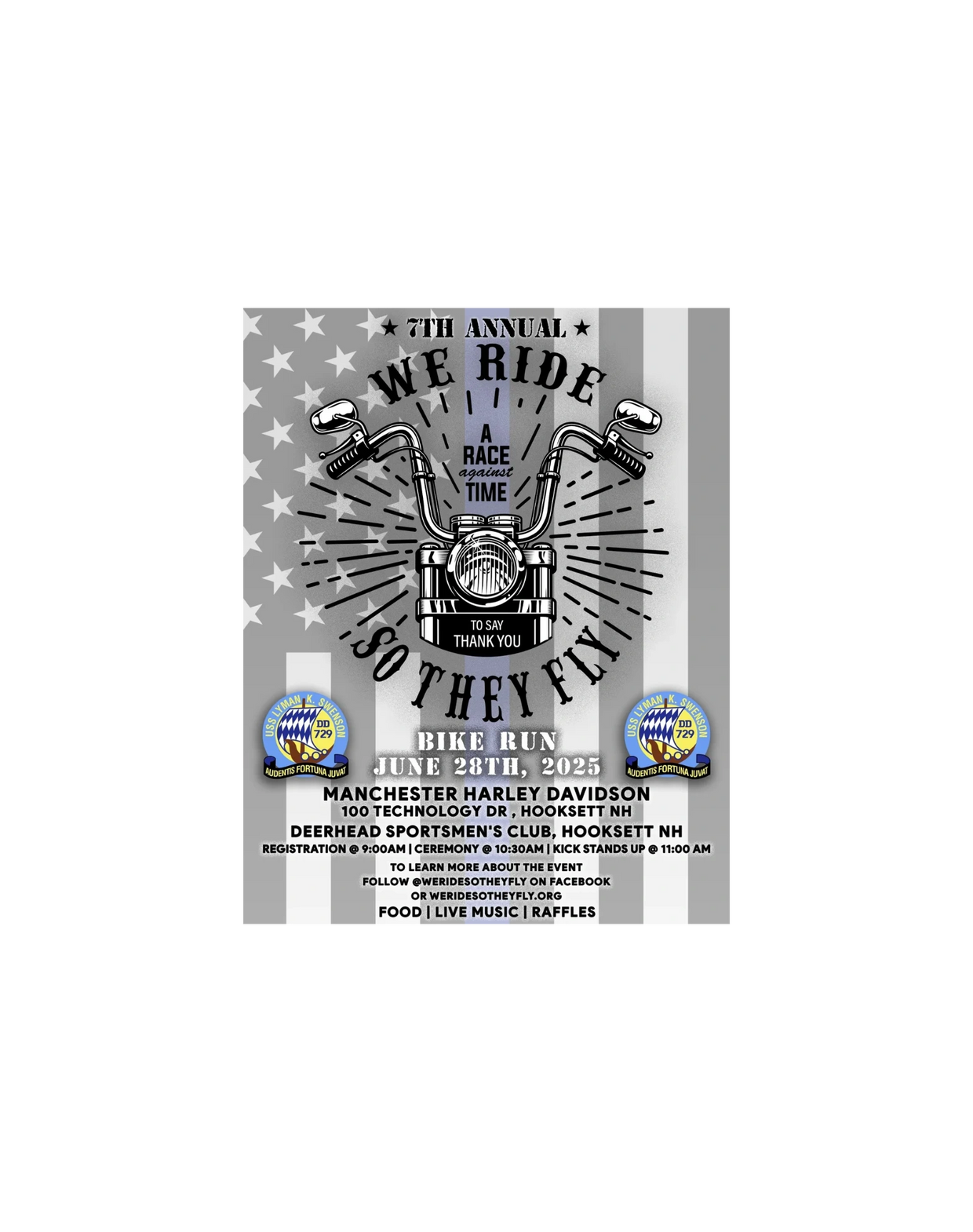 Join us for the 7th annual WE RIDE SO THEY FLY bike run for Honor Flight New England on Saturday, June 28, 2025 in memory of World War II hero, Paul Holmes. Registration begins at 9 AM Manchester Harley Davidson, 100 Technology Dr. Hooksett, NH. Ceremony begins at 10:30 and KSU at 11:00 am!